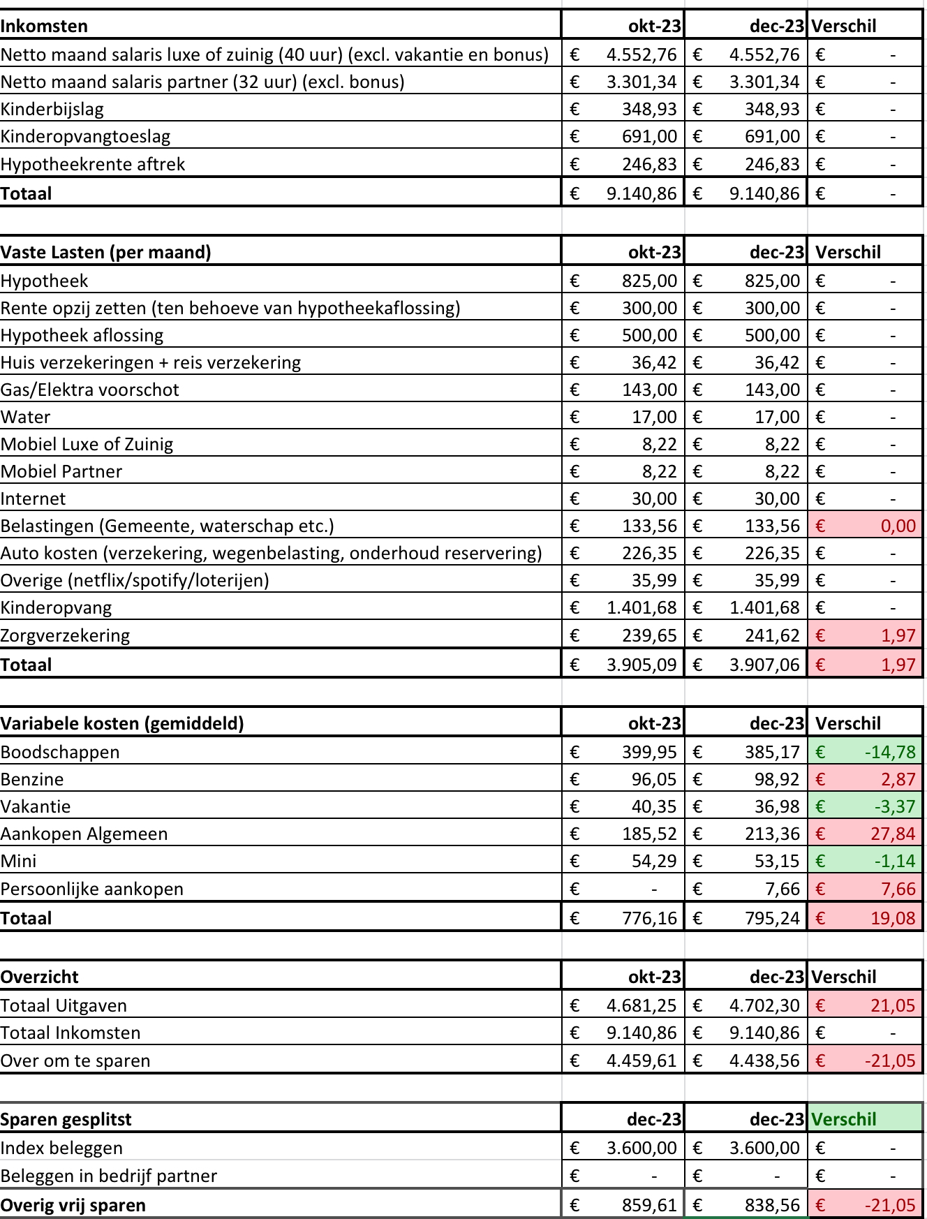 Onder de streep zien we een klein minnetje van €21,05. En dit is volledig te danken aan meer variabele uitgaven. Een resultaat waar ik best trots op ben. Nu is het alleen te hopen dat we aankomend kwartaal niet weer ver omhoog gaan…. We gaan het meemaken.